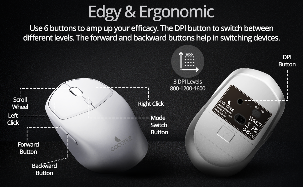 6 BUTTONS : The Wireless Mouse for laptop has 6 buttons, with the forward & backward buttons to add to your productivity, and mode switch to quickly change between devices. And the DPI button on the bottom to switch between different levels of Dpi