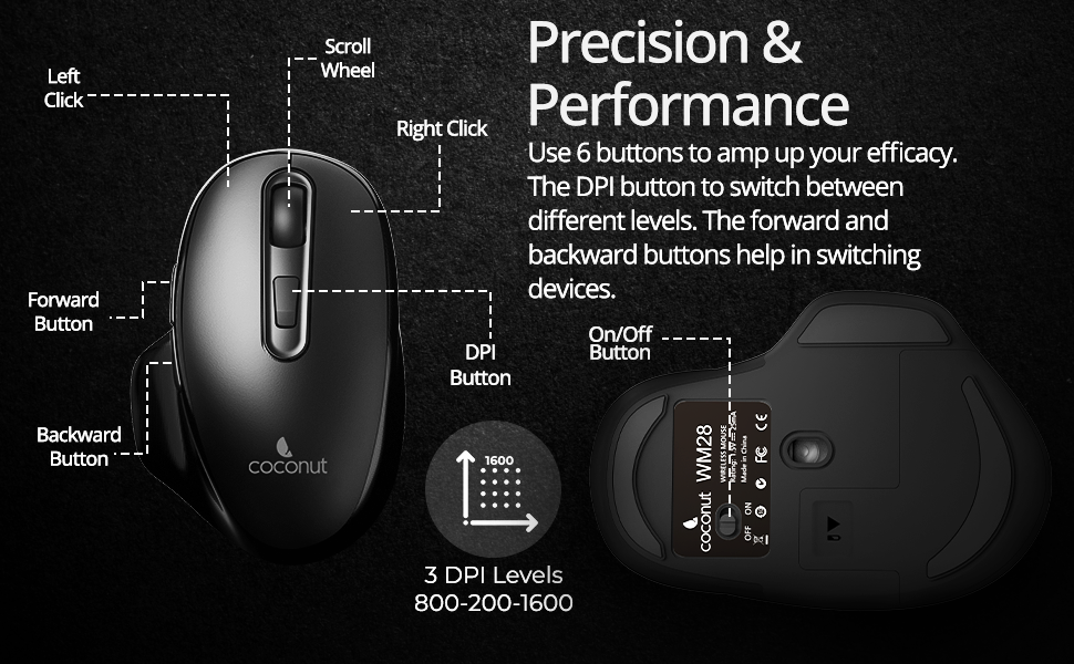 6 BUTTONS : The Wireless Mouse for laptop has 6 buttons, with the forward & backward buttons to add to your productivity and the DPI button to switch between different levels of DPI