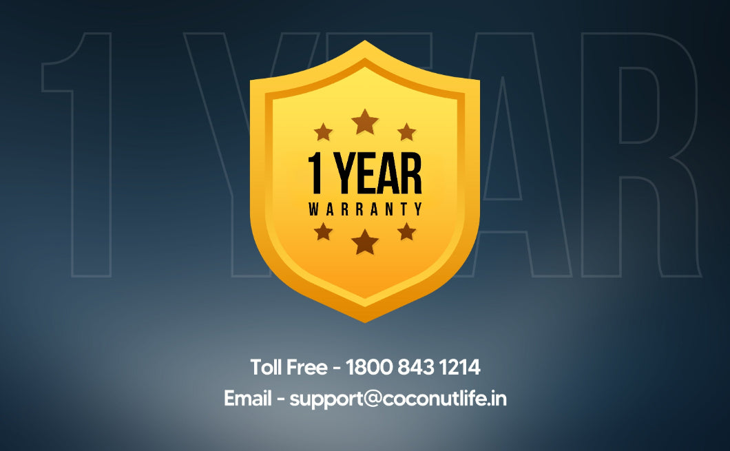 1 YEARS WARRANTY : Coconut provides a 1 Year Warranty . Toll Free - 1800 843 1214 , Email - support@coconutlife.in