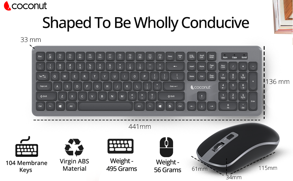 - The keyboard (441 x 136 x 33 mm) and mouse (115 x 61 x 34 mm) feature an ergonomic design, providing comfort during prolonged use.