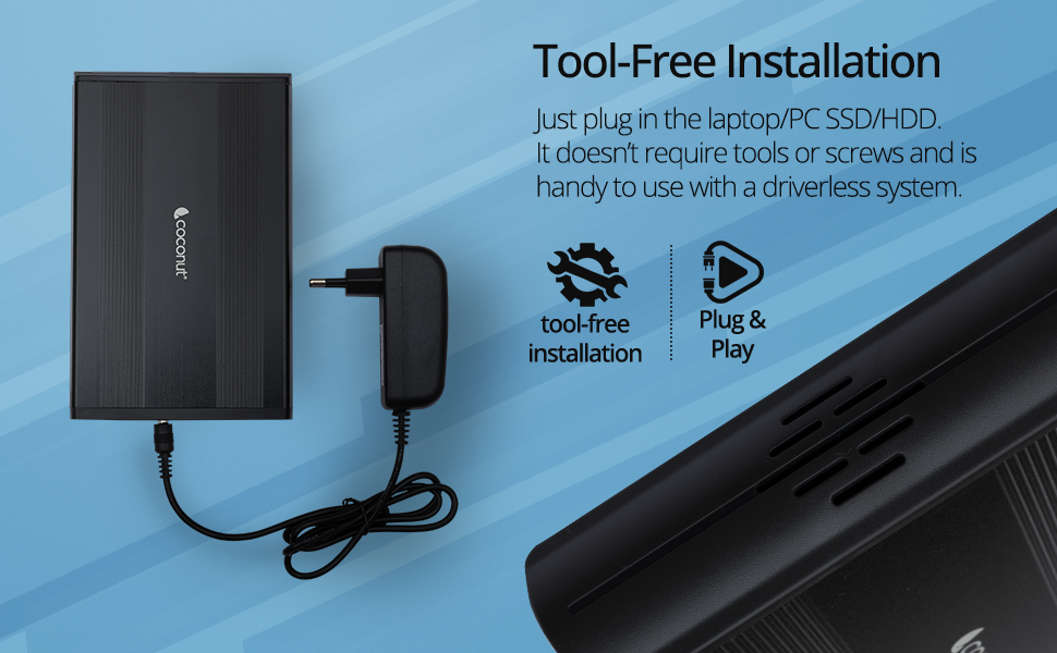 TOOL FREE INSTALLATION Just Plug in the Laptop/ PC SSD/HDD with screw free mounting , and and tool-free installation, it is very handy to use this HDD enclosure with a driverless system